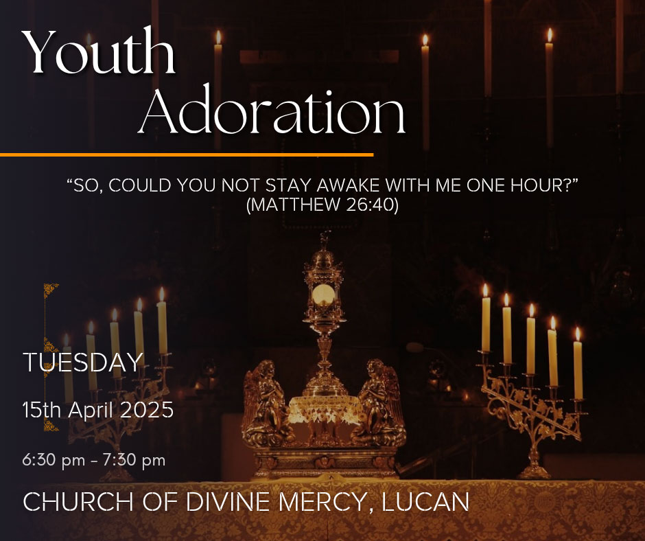 On Tuesday 15th April there will be Youth Adoration in the Church of Divine Mercy from 6:30pm – 7:30pm. “So, could you not stay awake with me one hour?” (Matthew 26:40)